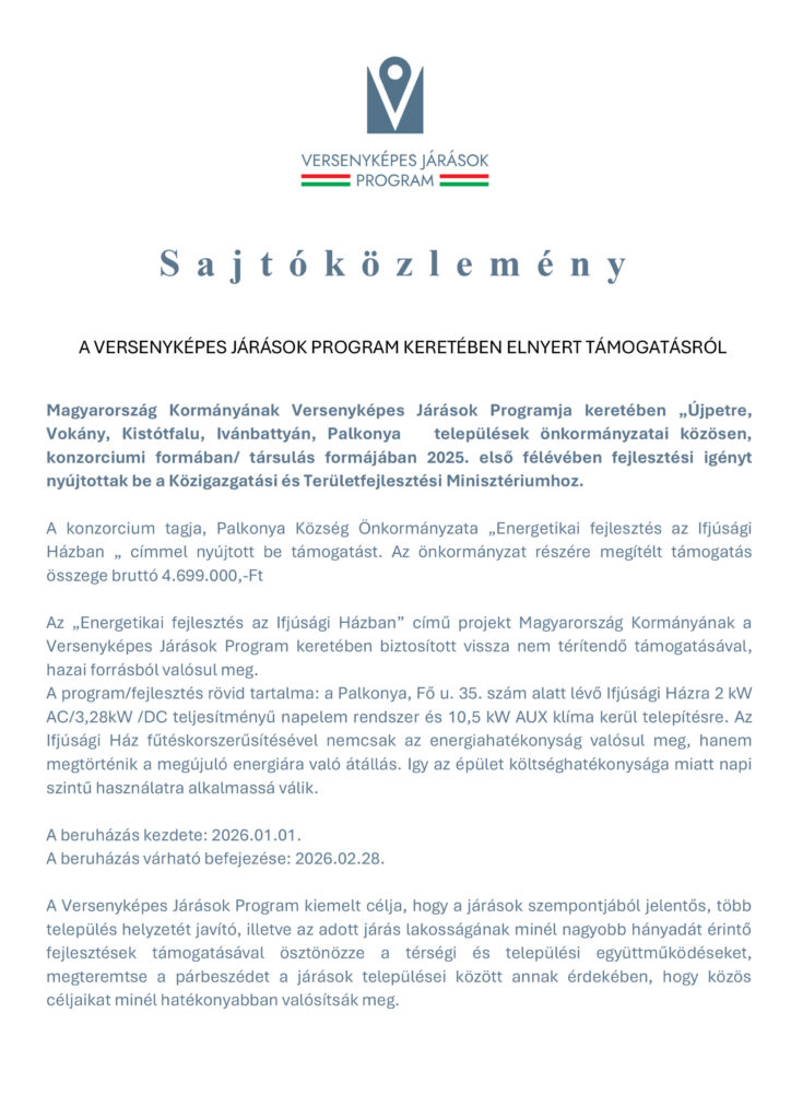 Az „Energetikai fejlesztés az Ifjúsági Házban” megvalósul Magyarország Kormányának a Versenyképes Járások Program keretében biztosított 4.699.000,- forint összegű támogatásával.